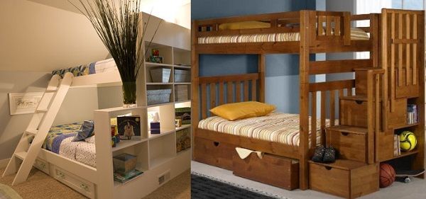 Las literas son, quizás, las camas favoritas por los niños. Estas, además de ser dos camas ocupando el mismo lugar, conforman un mueble que nos ayuda a economizar aún más el espacio de la habitación. Así, mientras en la imagen de la izquierda, la estructura se convierte en una estantería dividida en habitáculos cuadrados, la segunda aprovecha los escalones para convertirlos en cajones donde poder aguardar libros, juguetes u otras pertenencias.
