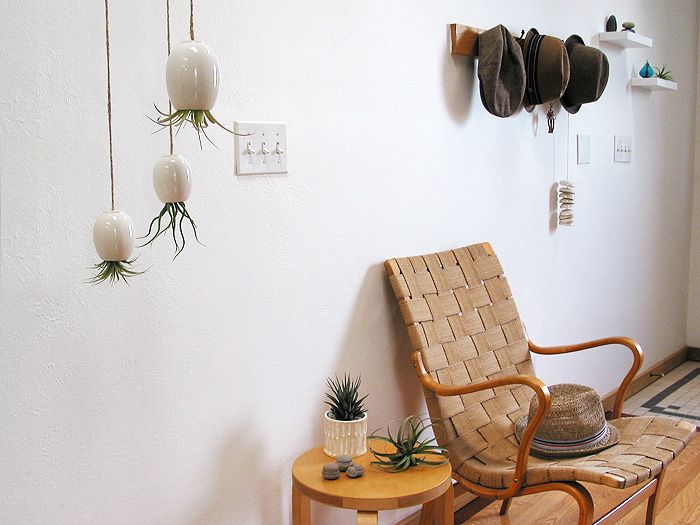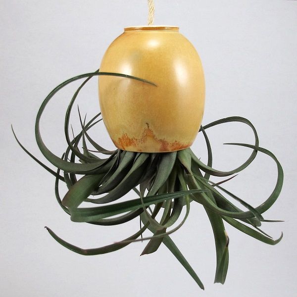 Bajo una forma de huevo y colocado al revés de como habitualmente solemos encontrarlo, este macetero está pensado exlusivamente para las tillandsias, plantas de interior que, colocadas así, son capaces de absorber sólo el agua que necesitan.