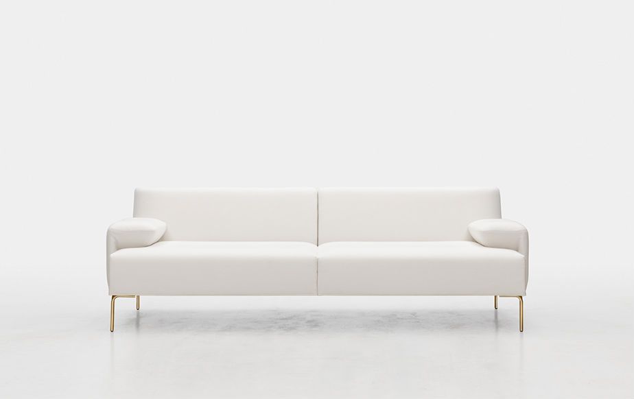 Para ello, podríamos inspirarnos en un sofá como este. El color blanco y sus patas metálicas con acabado dorado nos va a ayudar a crear un ambiente completamente sofisticado y elegante. En él, contemplamos un gusto por lo sensible y especial gracias a sus líneas rectas y refinadas.