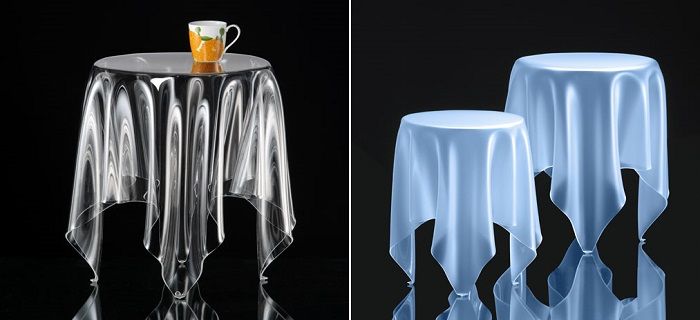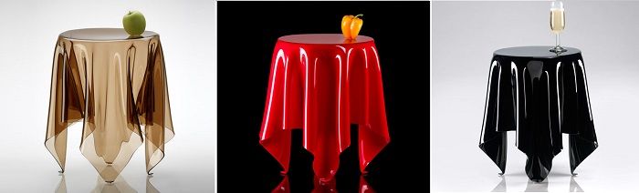 La mejor opción para integrar en el hogar es el resultado de la combinación entre el diseño y el arte. Precisamente cumpliendo estas premisas, nos encontramos con esta singular mesa de bar cuyo diseño es más que sorprendente. Y es que se trata de una mesilla que, en forma, se convierte a su vez en un mantel que se extiende hasta el suelo. De hecho, su apariencia es tan real que resulta casi mágica su sujeción.