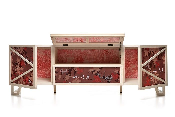 Nos encontramos ante unos muebles con mucha personalidad. Se trata de una concepto muy original basado en una pieza hecha a base de polyester con estampado floral y madera en sus marcos. El resultado es, tal y como podemos apreciar, único. En el caso de este armario-vitrina, no cabe duda que se convierte en una opción ideal para crear contrastes de estilo en un mismo espacio.