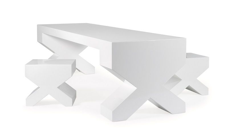 Centrándonos en esta mesa lacada en blanco, podemos decir que estamos ante una excelente opción para otorgar un toque diferente y cretivo al espacio. bajo un concepto totalmente distinto al habitual, nos encontramos ante una mesa que transforma sus patas en cruz, además de sus sillas.