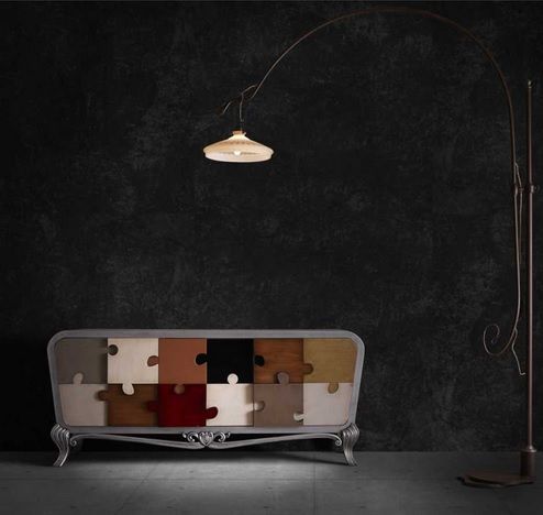 El tema principal de este entrañable aparador es el puzle donde quedan totalmente ocultas las tres puertas que dividen este singular mueble. Su estética retro se aprecia esencialmente en las patas y marco, con una estética más bien clásica.