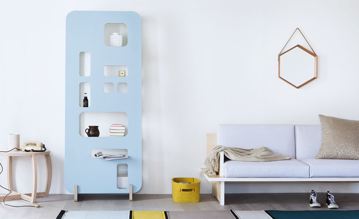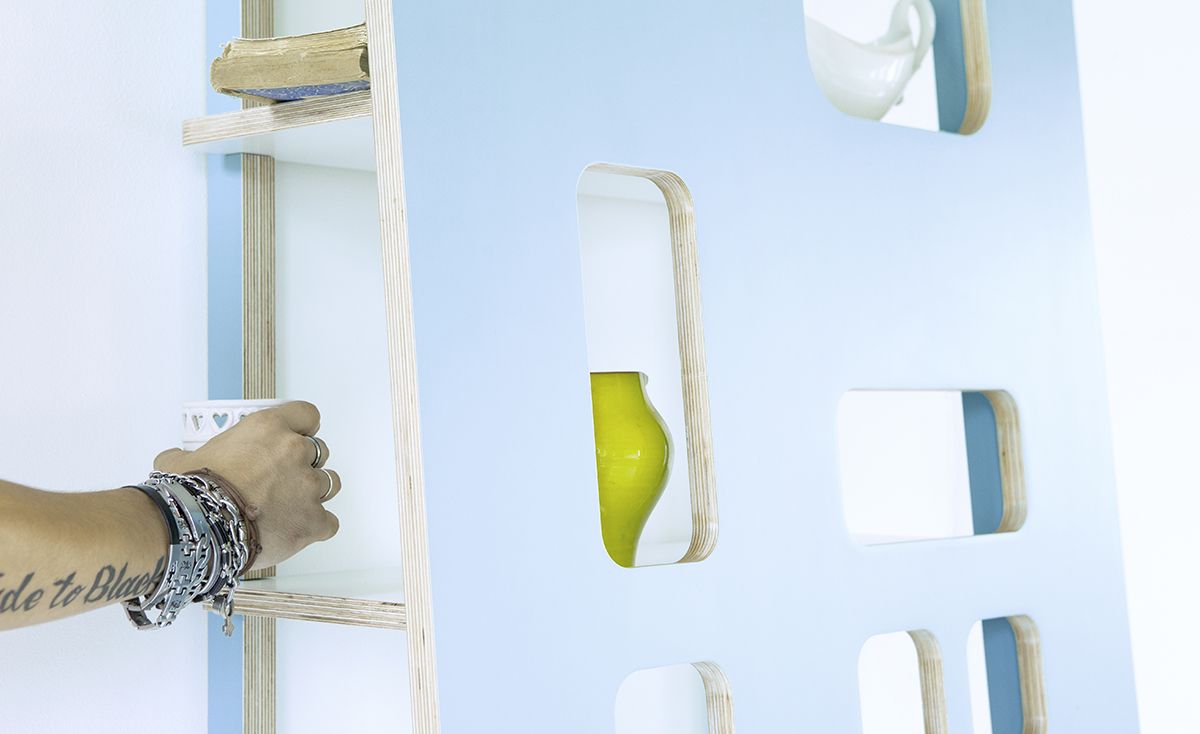 Como podemos apreciar, se trata de concepto muy original. No se trata de la clásica librería, sino que en ella se observan diferentes formas geométricas donde a través de ellas, colocamos los objetos decorativos.