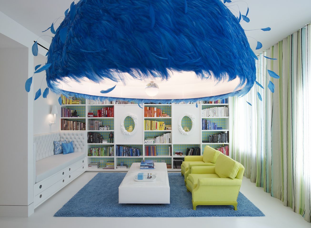La sala de estar se presenta con una apariencia muy vintage. El mobiliario y los papeles pintados de la pared, la convierten en una estancia que nos recuerda al interiorismo de épocas pasadas. Pero, sin duda, la lámpara de plumar azul klein, se convertirá en la única protaginista del espacio. Es realmente, espectacular.