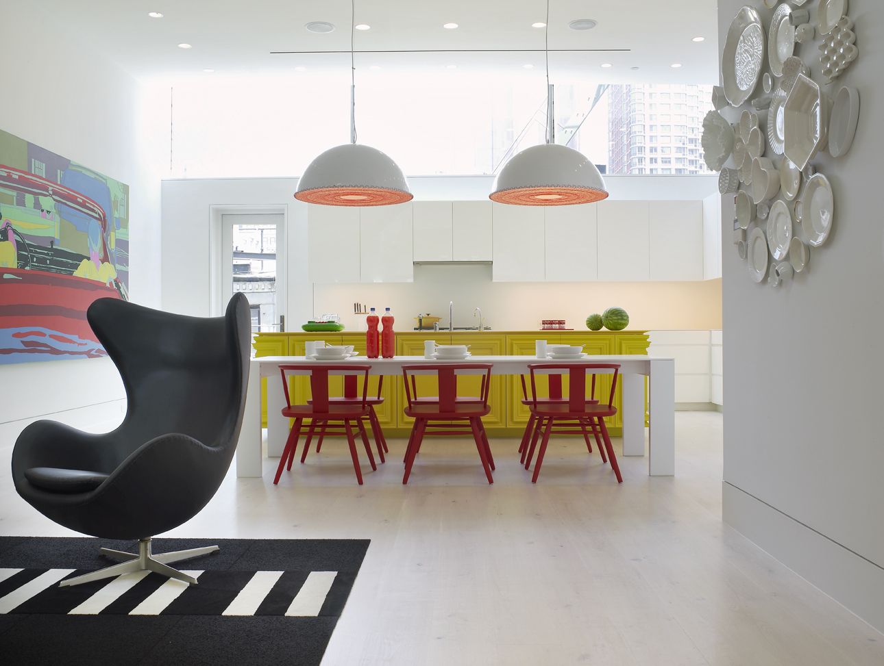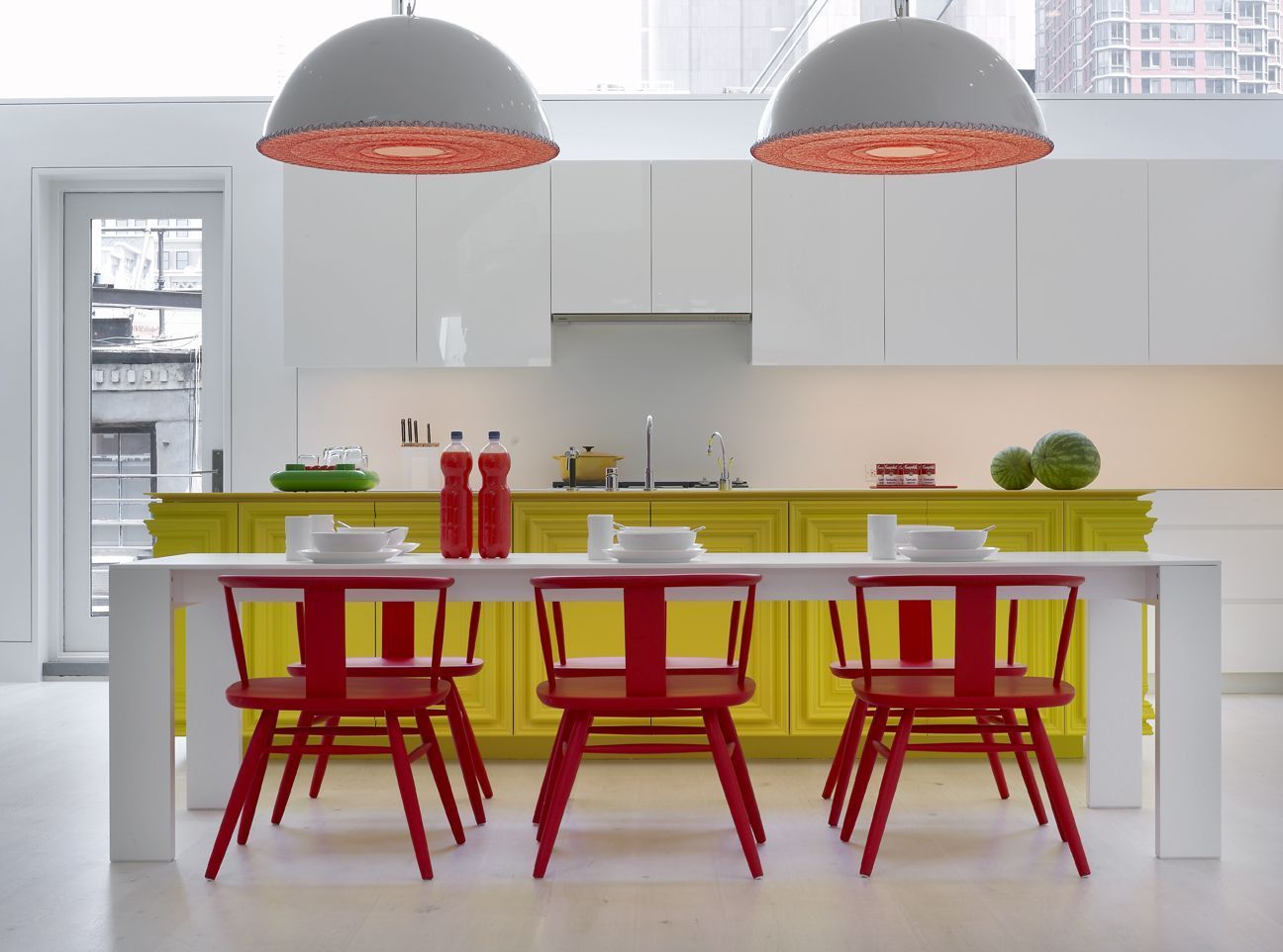 La cocina es, seguramente, uno de los espacios más peculiares. Con un marcado estilo moderno, esta estancia presenta un gran constraste de color, donde predominan el rojo, amarillo, en combinación con el blanco. Un equilibrio ideal para hacer que esta estancia sea perfecta para habitar durante grandes periodos de tiempo.