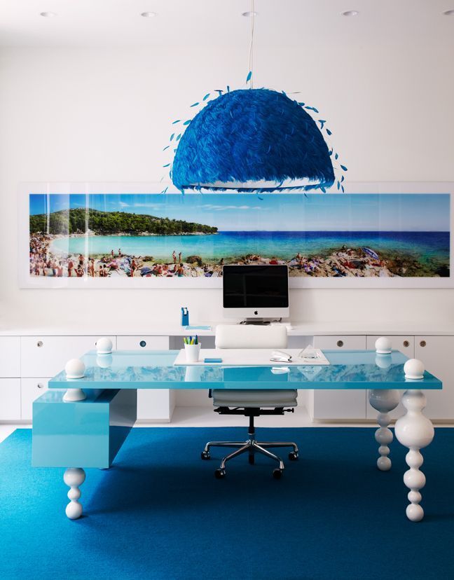 Y, siguiendo con la misma línea estética, la oficina de trabajo en el hogar, tiene también a la misma protagonista de la que hablábamos. El azul, predominanante en esta habitación, acoge un estilo vintage que le viene principalmente por este fantástico escritorio asimétrico.