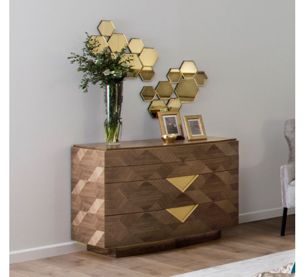 Muy en esta línea el comedor que se muestra con esta misma estética. El gusto por el dorado lo convierte en un espacio con clase y aire sofisticado. Lo mismo podemos decir de la cómoda para un hall, como vemos. Una estética muy marcada con un estilo único.