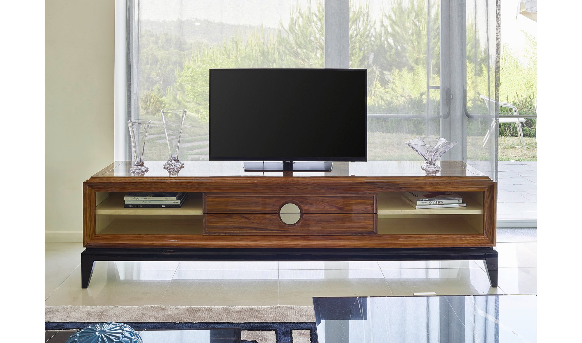 Entre los ejemplos, vemos un mueble de televisión vemos representado uno de sus también principales rasgos y es el indiscutible protagonismo de la geometría. Un mueble con líneas puras y destacando su perfil rectangular.