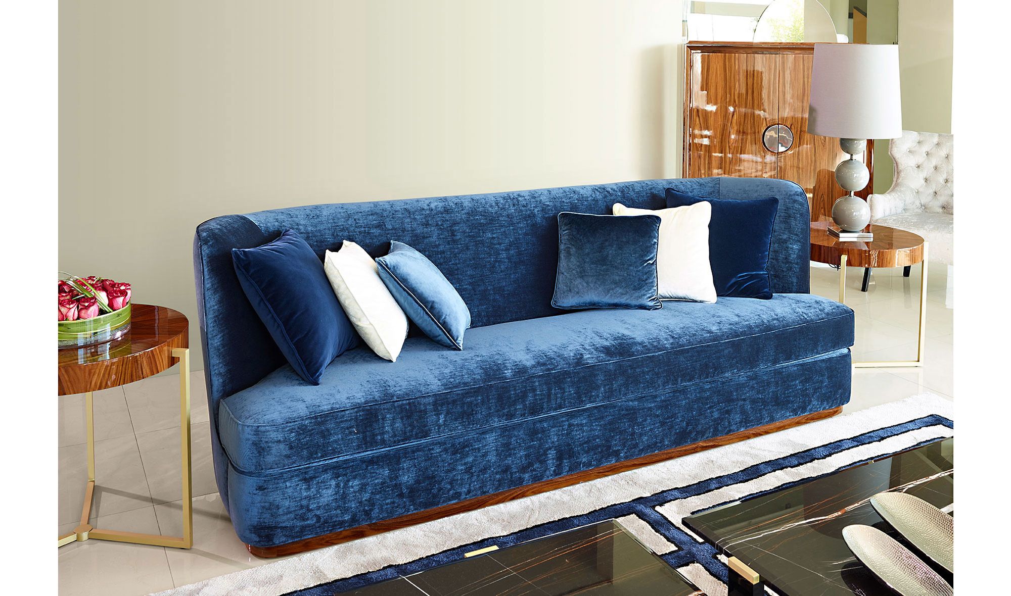 El sofá, con ese tono azulón, le devuelve al espacio un toque con mucha clase y personalidad. De la misma manera, el estilo Art Dèco se percibe muy bien en las mesillas que, con un formato geométrico y el material metálico con acabado en dorado resulta ideal para la creación de este tipo de espacios.